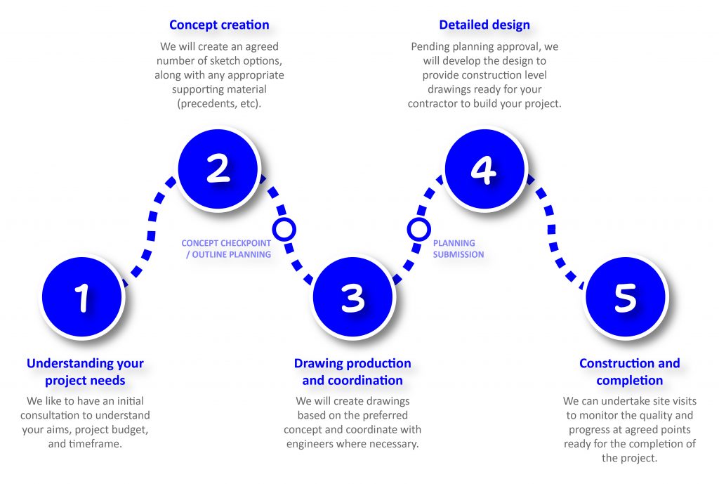As architects it’s our job to understand those and create beautiful bespoke solutions to your challenges. Whilst the process that we take is standardised, the outcomes will be entirely different. The steps below outline a typical approach to our design process: